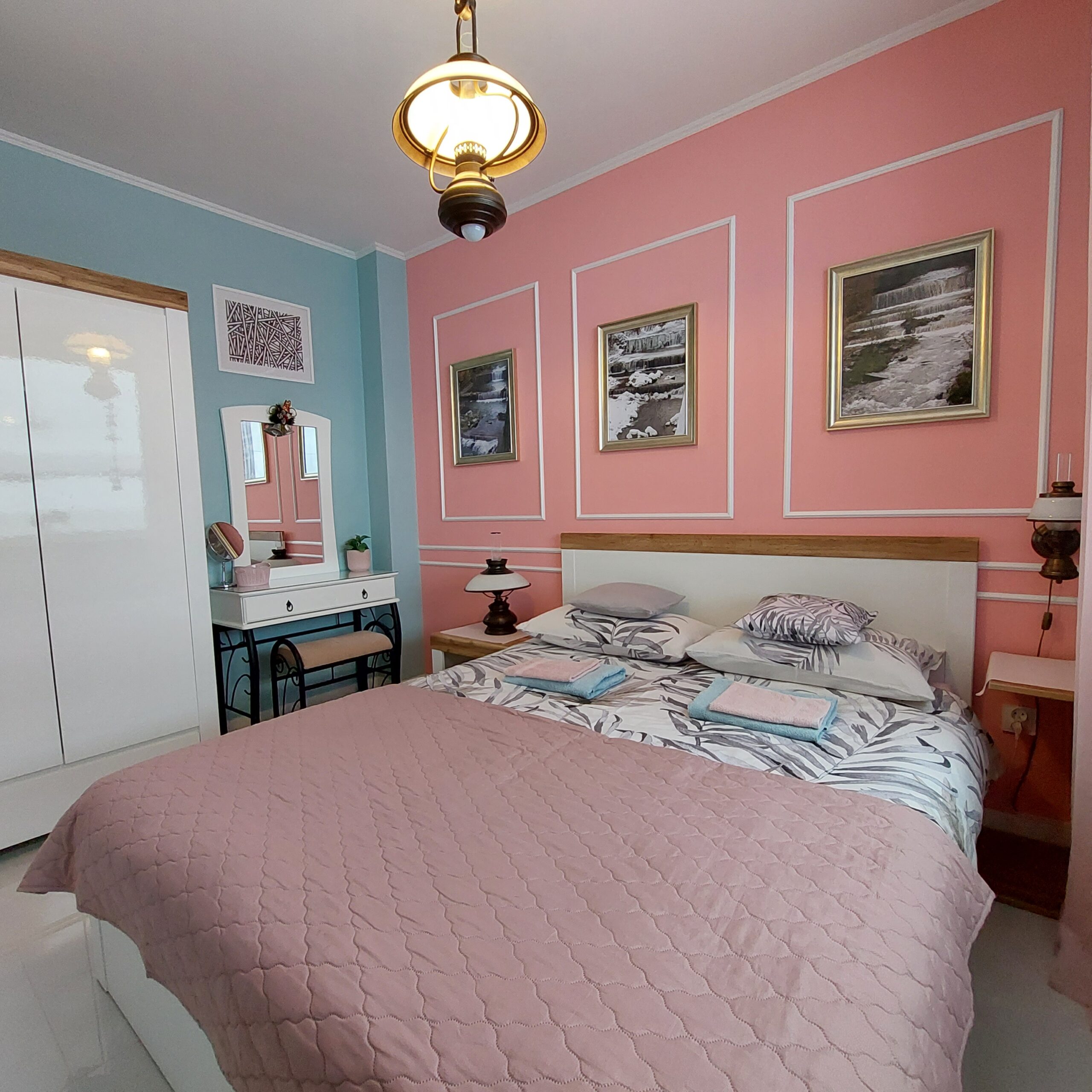 - 2 sypialnie, z dużymi małżeńskimi łóżkami, rozkładanymi kanapami, szafami oraz komodami. Każda z łazienką wyposażoną w prysznic, umywalkę, suszarkę do włosów i WC z funkcją bidetu.