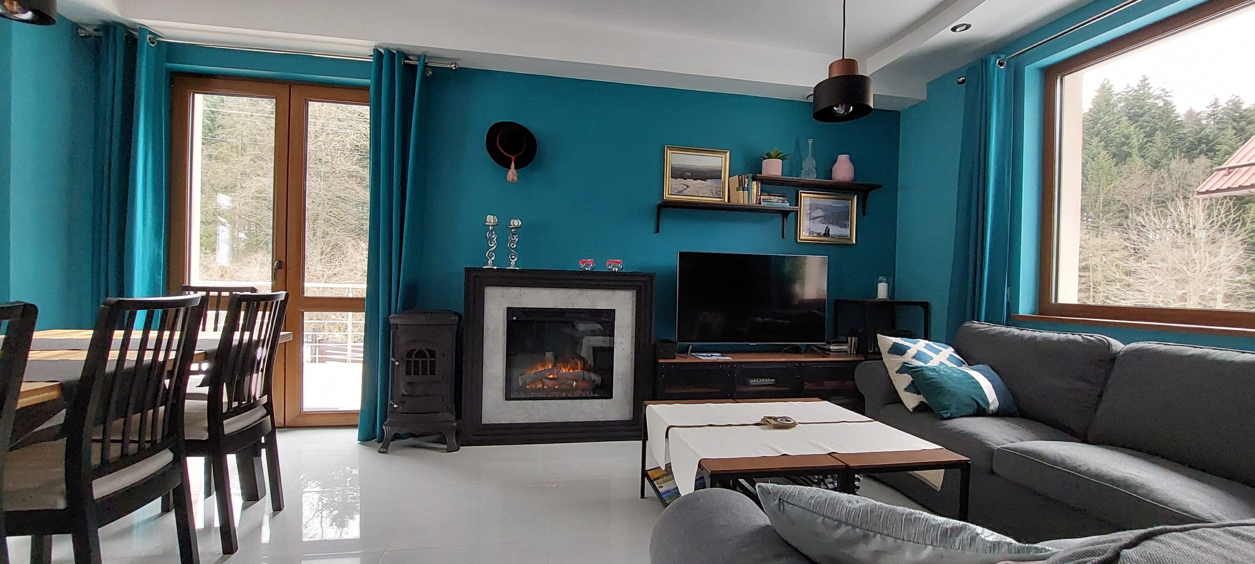 - salon z kominkiem elektrycznym, TV i radio z CD,