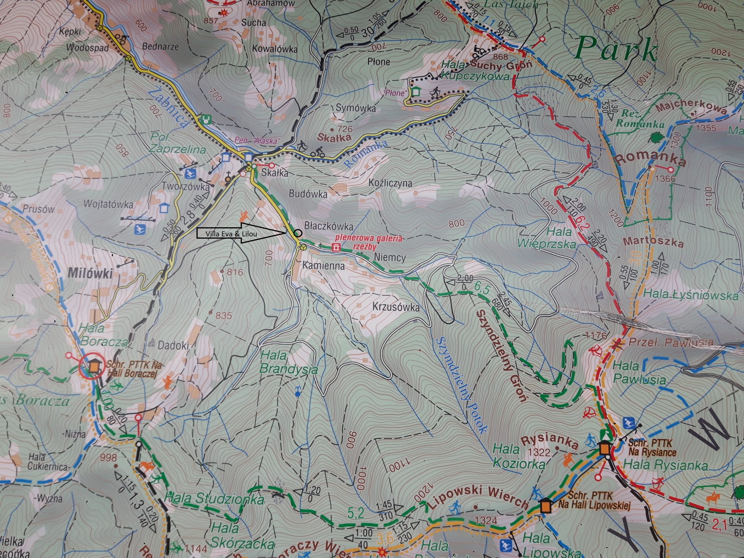 – Szlak turystyczny „zielony” na Halę Rysianka (1.322m n.p.m) – 2,5 godz, na Halę Lipowską (rozciągającą się na południowych stokach Lipowskiego Wierchu, na wysokości od 1.150 do 1.290m n.p.m.), na Halę Boraczą ( tu na wysokości 860m polecamy jagodzianki). Na Słowiankę (856m n.p.m.), Płone, Romankę (1.366m n.p.m.) a nawet na Pilsko (1.557m n.p.m.).